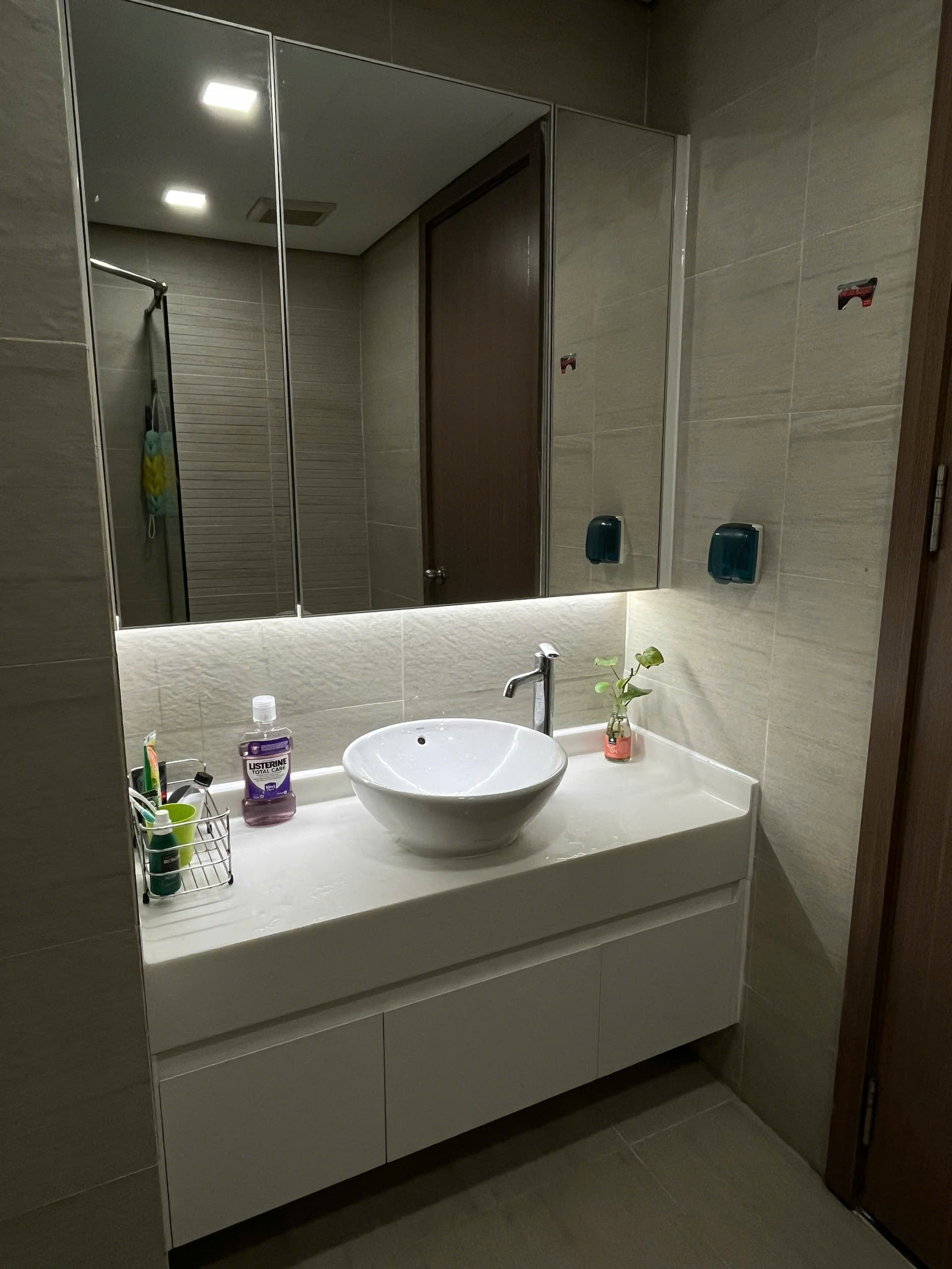 Đèn hắt sau gương mang lại ánh sáng dịu nhẹ, tạo cảm giác thư giãn như spa tại nhà.