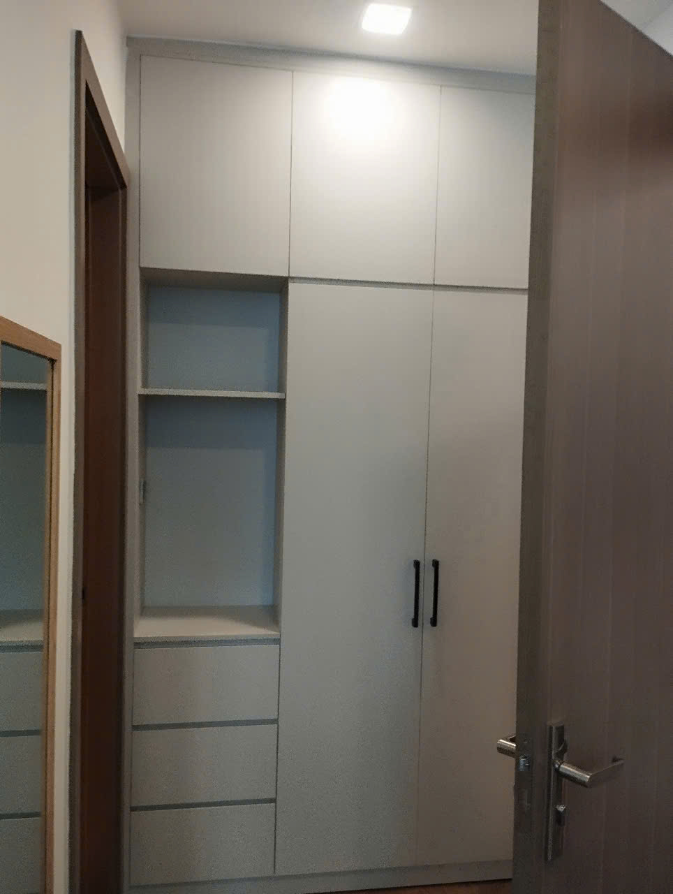 Khu vực phòng ngủ được bố trí tủ cao kịch trần, kết hợp hộc trang trí và ngăn kéo tiện dụng. Tông màu trắng ghi làm nổi bật ánh đèn trần, giúp không gian nghỉ ngơi thêm dễ chịu.