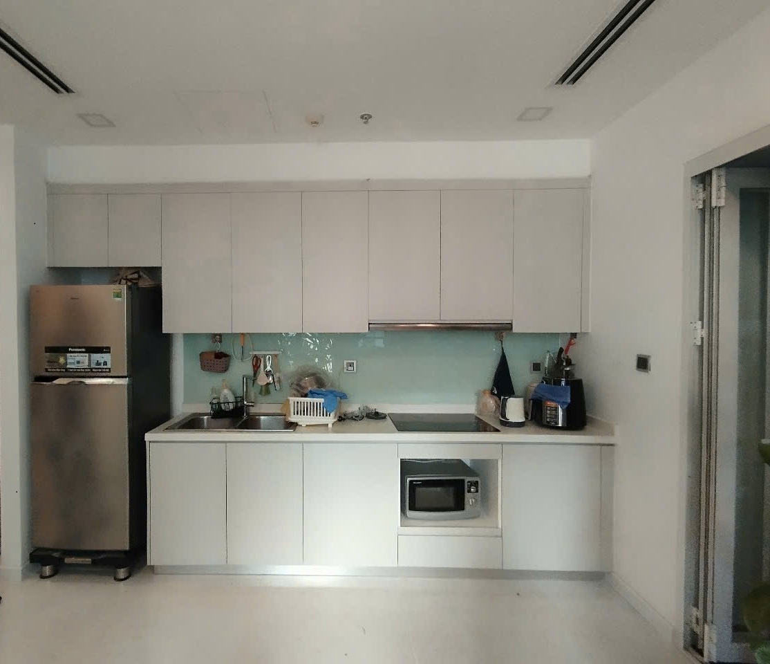 Không cần quá cầu kỳ, khu bếp được thiết kế với tủ trên – dưới phẳng màu trắng, kết hợp mặt đá solid trắng đồng tông. Kính bếp xanh mint dịu mắt, giúp không gian bếp sáng hơn mà vẫn dễ lau chùi.